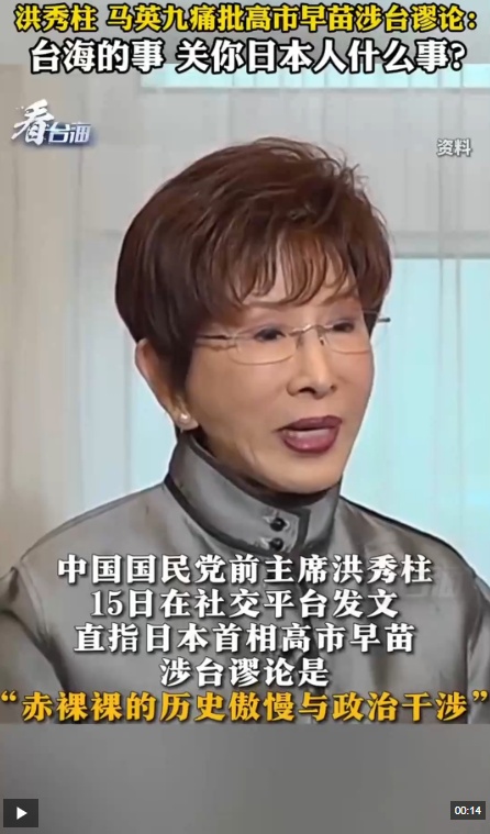 “台海问题与你们日本人民有什么关系?”中国国民党前主席洪秀柱15日在社交平台Facebook发文,直言日本右翼人士的言论这些政客“不仅挑衅,而且将台湾推向危险的边缘”。 “我们必须明确的是,台湾过去不是日本的殖民地。”洪秀珠表示,日本的殖民统治给台湾社会留下了很多历史伤痛,但至今还没有得到真正的道歉或赔偿。 “你还敢指出台海问题吗?这不是‘担忧’。”这纯粹是历史傲慢和政治干涉。”他强调,中华民族有智慧、有能力处理两岸问题。台海和平不取决于日本的军事力量,也不取决于美国的算计,而是取决于两岸人民的共同努力。